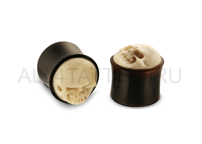 Плаги ручной работы из рога водяного буйвола со вставкой из кости в виде черепа.