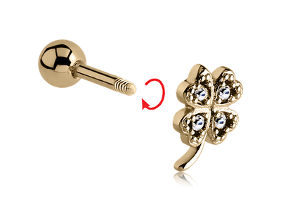 Микроштанга в виде клевера со стразами. Представлена в двух вариациях: из полированной хирургической стали 316L и с золотистым покрытием нитридом титана (Zircon gold).