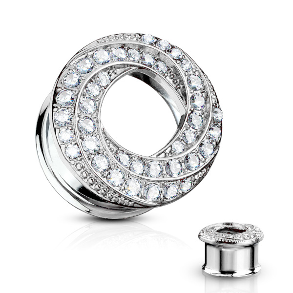 Тоннели из хирургической стали 316L с фасадом из родированной латуни в комбинации со стразами. Малые диаметры (6 и 8 мм) представлены в вариации с декоративным фасадом без страз.