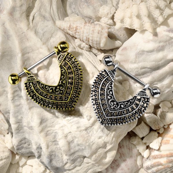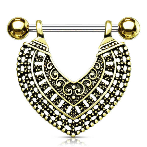 Украшение для груди со штангой из хирургической стали 316L и декоративной частью из родированной латуни. Представлена вариация с золотым покрытием.