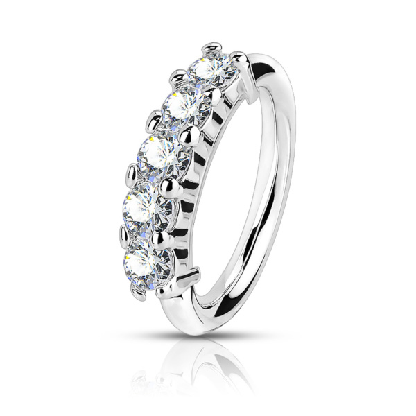 Раздвижное кольцо из хирургической стали 316L с пятью прозрачными фианитами в латунной декоративной части.