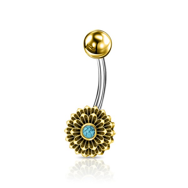 Банан со штангой из хирургической стали 316L и латунной декоративной частью в виде цветка с вставкой из синтетической бирюзы в центре.