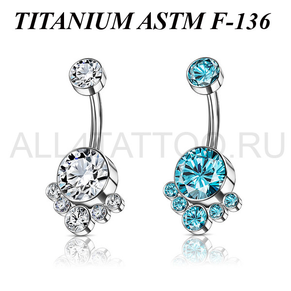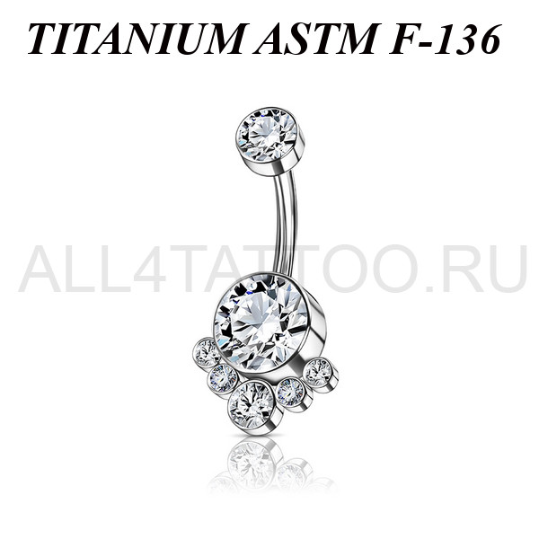 Банан с внутренней резьбой из имплантационного титана 6Al-4V-Eli ASTM: F-136. Украшен фианитами. Размер крупного нижнего кристалла: 8,2мм, верхнего: 5мм.