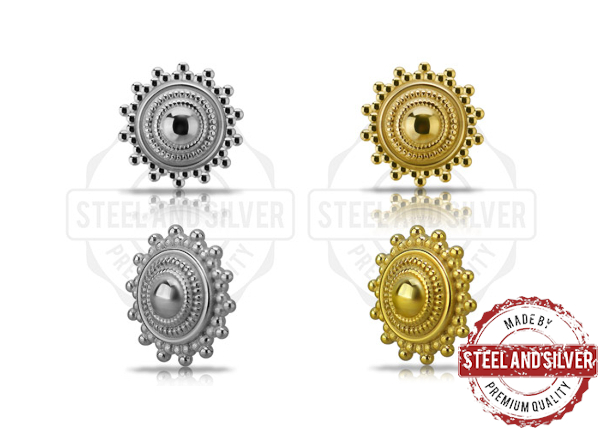 Накрутка из хирургической стали 316L диаметром 10мм. Две вариации: полированная и с PVD покрытием 24х каратного золота. Подходит для украшений толщиной 1.6мм с внешней резьбой.