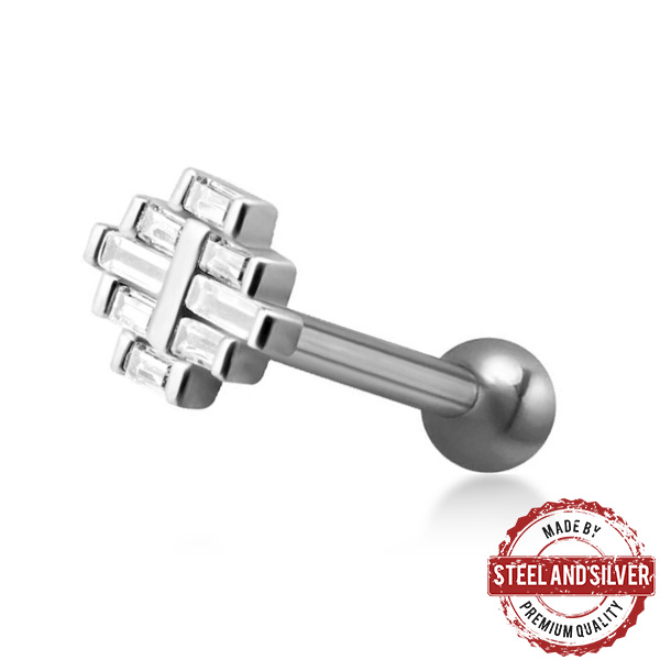 Микроштанга с внутренней резьбой из хирургической стали 316L. Представлена в двух вариациях: классическая стальная и с покрытием 24х каратного золота. Накрутка украшена прозрачными фианитами с огранкой "багет". Размер декоративной части: 6х8мм.