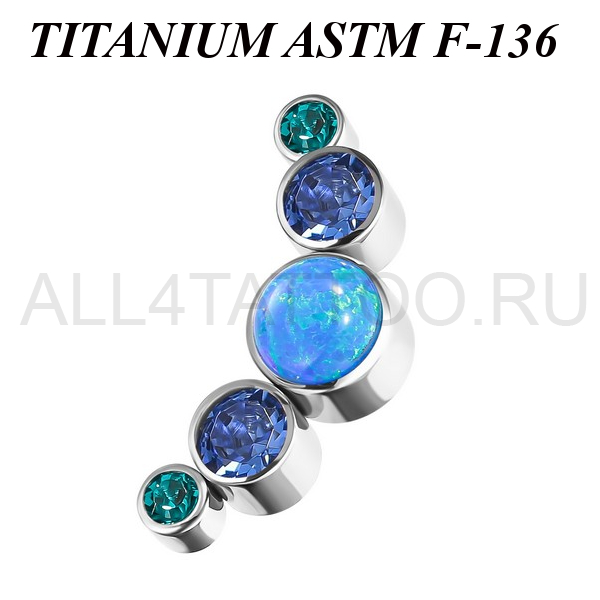 Кластер из имплантационного титана 6Al-4V-Eli ASTM: F-136. Украшен лабораторным опалом и цветными фианитами. Размер декоративной части: 13х5,3мм. Подходит для украшений с внутренней резьбой толщиной 1 и 1,2 мм.