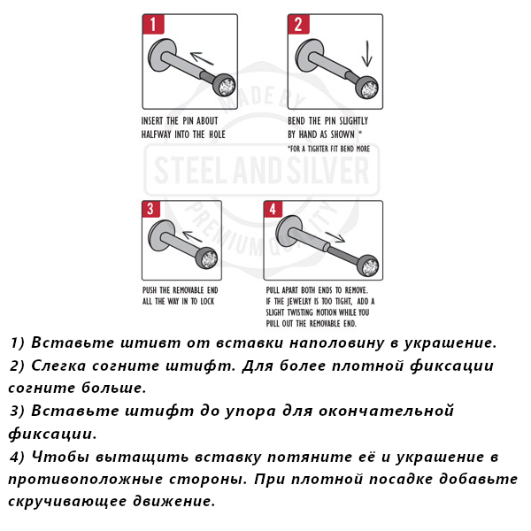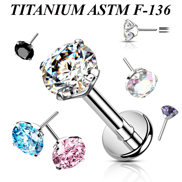 Безрезьбовой лабрет из имплантационного титана 6Al-4V-Eli ASTM: F-136. Украшен круглым фианитом, закрепленном в четырёх лапках.