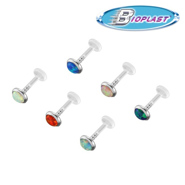 Лабрет из материала Bioplast со вставкой из  имплантационного титана 6Al-4V-Eli ASTM: F-136, украшенной лабораторным опалом.