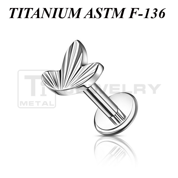 Лабрет из имплантационного титана 6Al-4V-Eli ASTM: F-136 с внутренней резьбой. Украшен накруткой в форме трёх лепестков. Размер накрутки:  6х5мм.