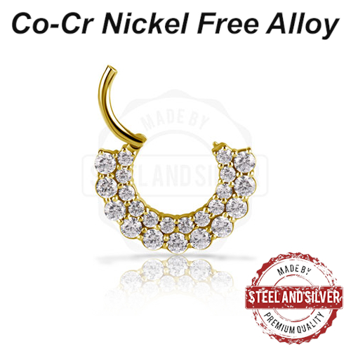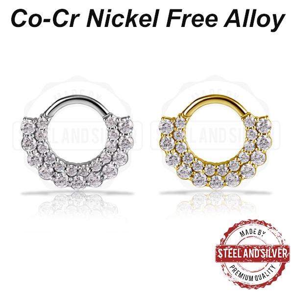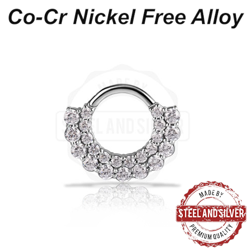 Кликер из сплава кобальт-хрома, без содержания никеля. Украшен двойным рядом прозрачных кристаллов Premium Cubic Zirconia. Представлен так же в варианте с 18-каратным золотым PVD покрытием.