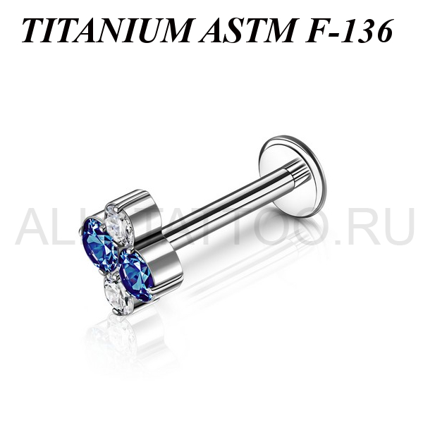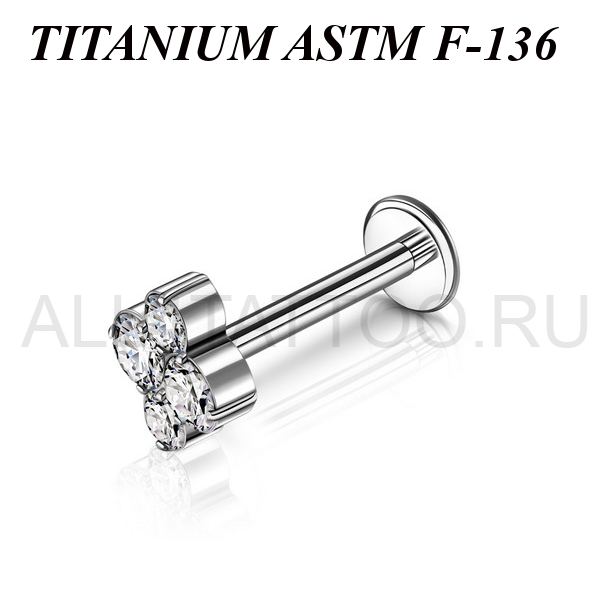 Лабрет из имплантационного титана 6Al-4V-Eli ASTM: F-136 с внутренней резьбой. Украшен кластером с фианитами. Размер декоративной части: 6х7мм.