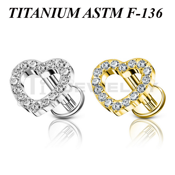 Лабрет из имплантационного титана 6Al-4V-Eli ASTM: F-136 с накруткой в форме сердца, украшенного прозрачными фианитами. Представлен в двух вариантах: классичесий титановый и с золотым PVD покрытием. Размер декоративной части: 7х6,5мм.