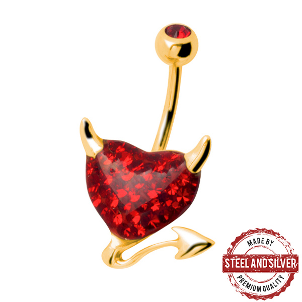 Банан из хирургической стали 316L с PVD покрытием 18ти каратного золота. Декоративная часть выполнена в виде фигурного сердца, украшенного кристаллами.