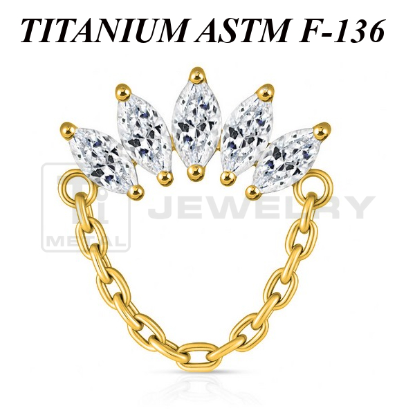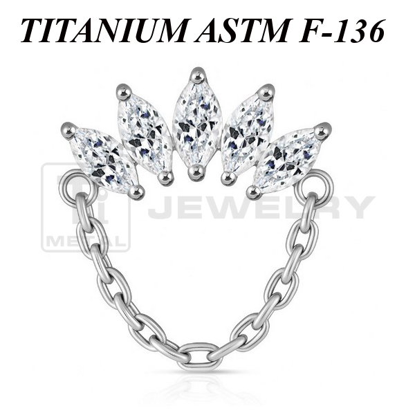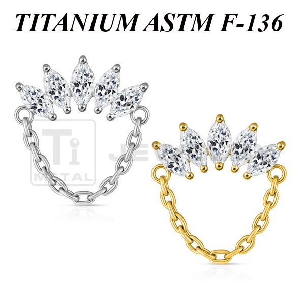 Кластер из имплантационного титана 6Al-4V-Eli ASTM: F-136. Представлен в двух вариантах: классический титановый и с золотым PVD покрытием. Украшен прозрачными фианитами огранки "маркиз". Размер кластера с учётом цепочки: 12х14,5мм. Подходит для украшений с внутренней резьбой толщиной 1 и 1,2 мм.